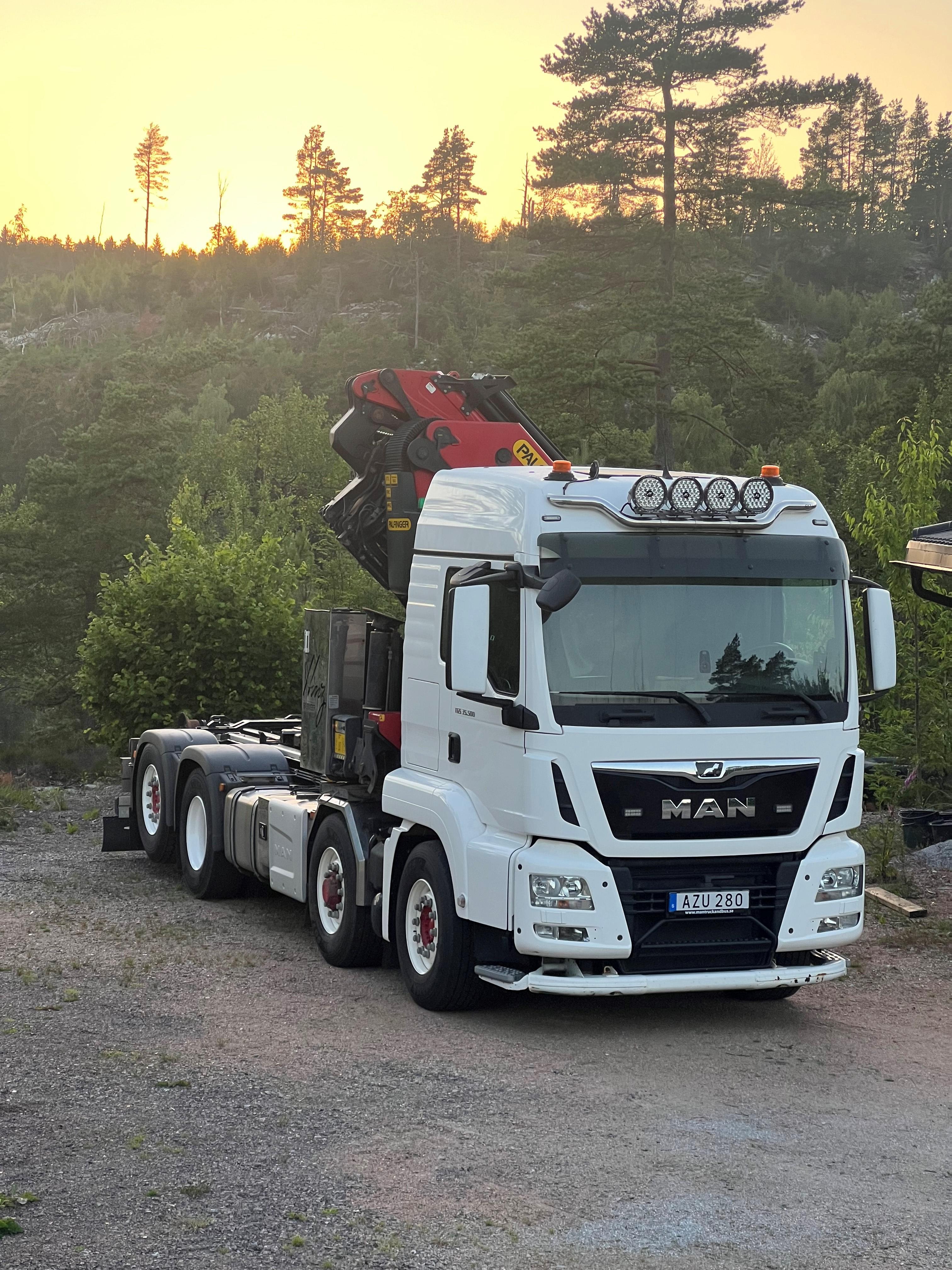 Med vår 4-axlade kranväxlare med en kran på 53-tonmeter är vi mycket mångsidiga. Palfingerkranen har en räckvidd på drygt 30 meter med jibben monterad. Kranbilen har driv på 2 axlar vilket gör det enkelt att ta sig fram i tuff terräng. Den är även utrustad med lastväxlarsystem så vi kan byta flak vid olika behov. Självklart klarar den det senaste avgaskravet Euro 6. Vi har redskap som gripskopa, gripsåg, betonglegosax, lyftok, pallgafflar, materialbask, svanhals mm.
