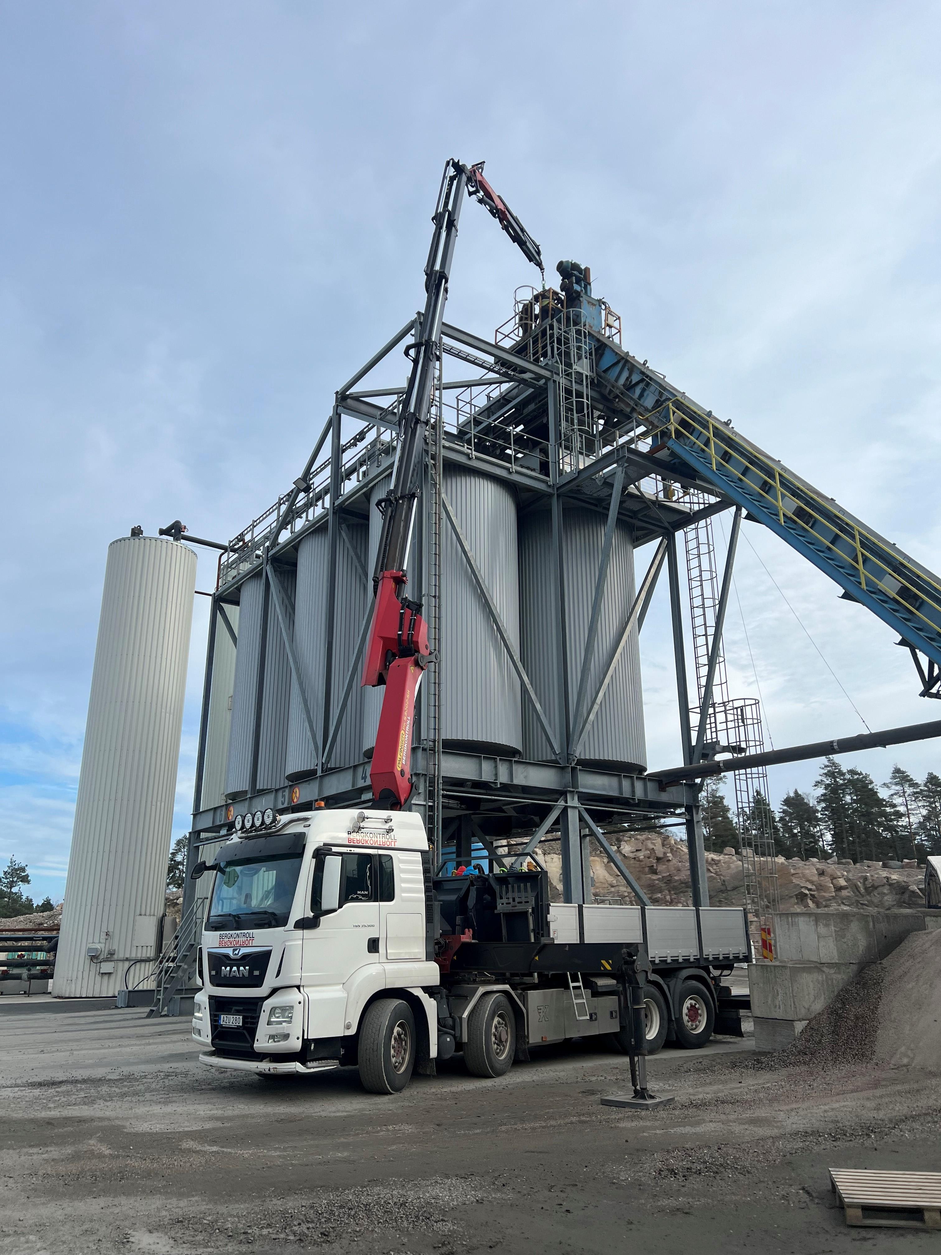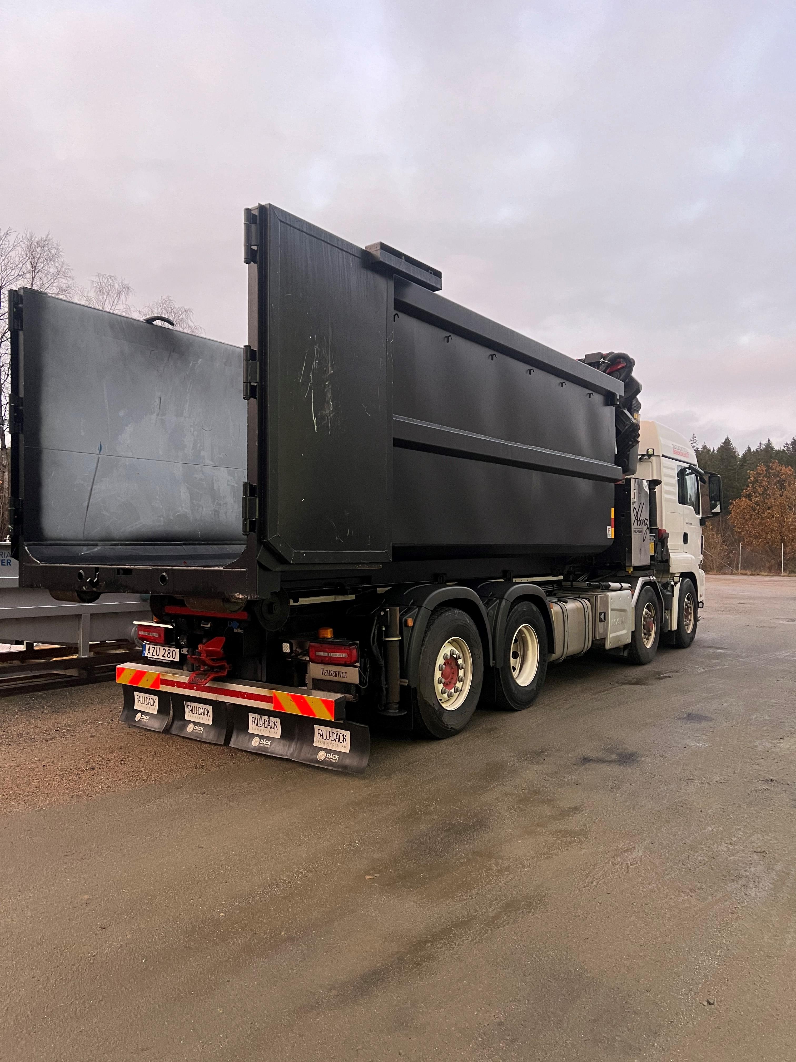 Med vår 4-axlade kranväxlare med en kran på 53-tonmeter är vi mycket mångsidiga. Palfingerkranen har en räckvidd på drygt 30 meter med jibben monterad. Kranbilen har driv på 2 axlar vilket gör det enkelt att ta sig fram i tuff terräng. Den är även utrustad med lastväxlarsystem så vi kan byta flak vid olika behov. Självklart klarar den det senaste avgaskravet Euro 6. Vi har redskap som gripskopa, gripsåg, betonglegosax, lyftok, pallgafflar, materialbask, svanhals mm.